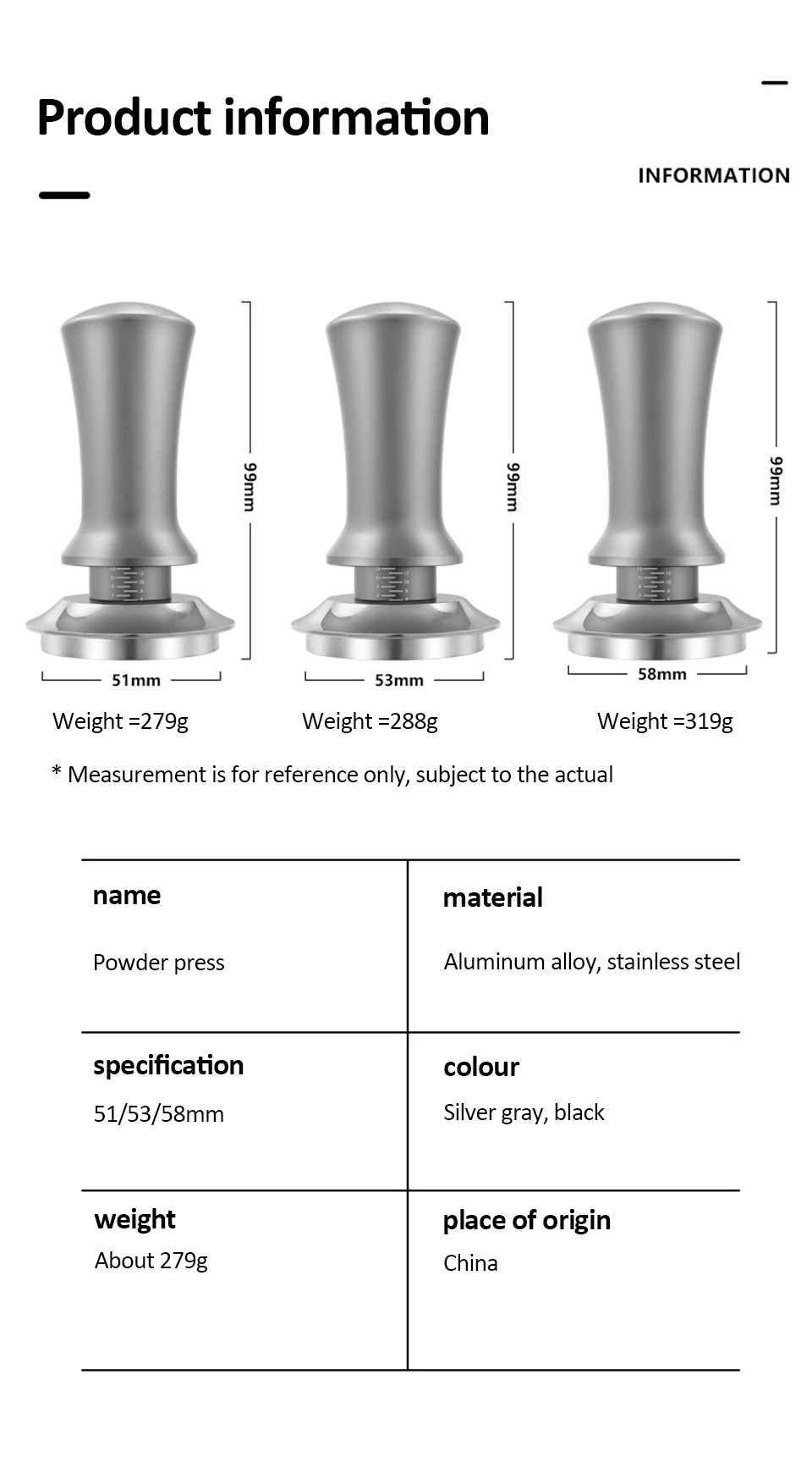 5.Multiple sizes to choose from: This powder press comes in three different sizes (51mm, 53mm, and 58mm) and is compatible with various espresso machines and coffee brewing equipment. Please use a tamper with the same diameter as your filter basket for better sealing.